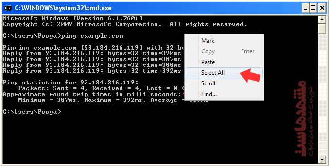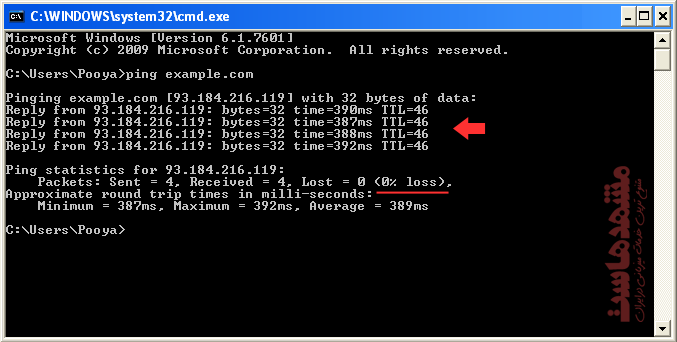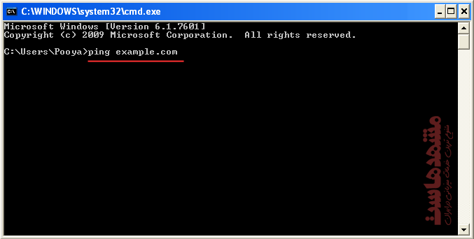 2- در خط فرمان دستور ping را همراه با نام دامنه خود بنویسید و کلید Enter را بزنید. (مطابق عکس)